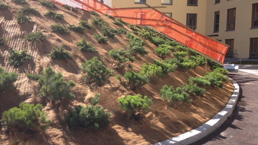 Uuden pensasistutusalueen pintaeroosion hallinta ja pensaiden kasvun edistäminen pensaseroosiomatolla Greenfix 9.