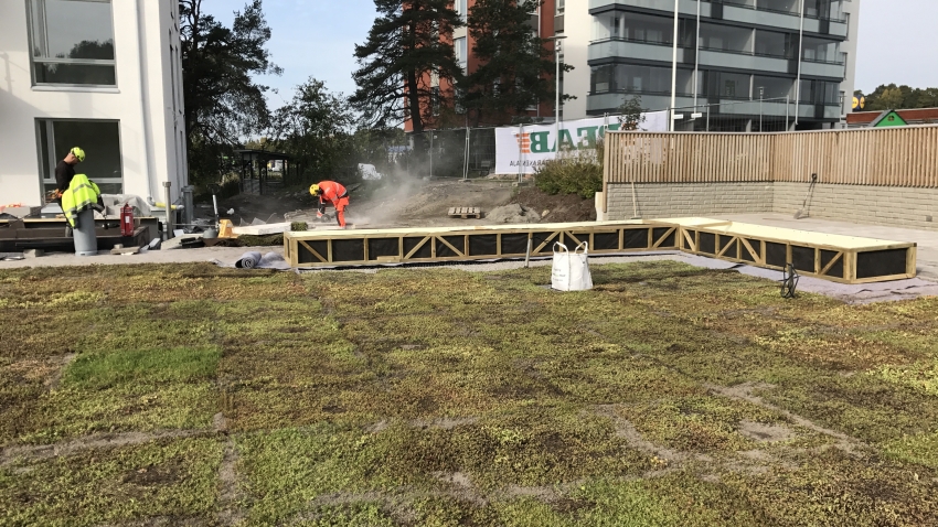 På objektet finns Nordic Green Roof™ sedumtak, Diadem cellsystem för takträdgård Diadrain 25 och Diadem KSE kontrollådor, i planteringslådorna används Diadem Diadrain 40 celler och Plantex markduk.