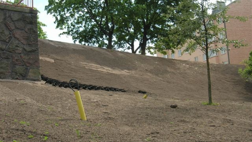 Soilweb kennostoa asennettu jyrkkiin rinteisiin. Soilwebin yläosat injektoitu kiinni harjateräksillä olemassa olevaan kallioon. Maatäyttö ja Greenfix 7 normaali kookoseroosiomatto pinnassa sekä leviävät perennat.