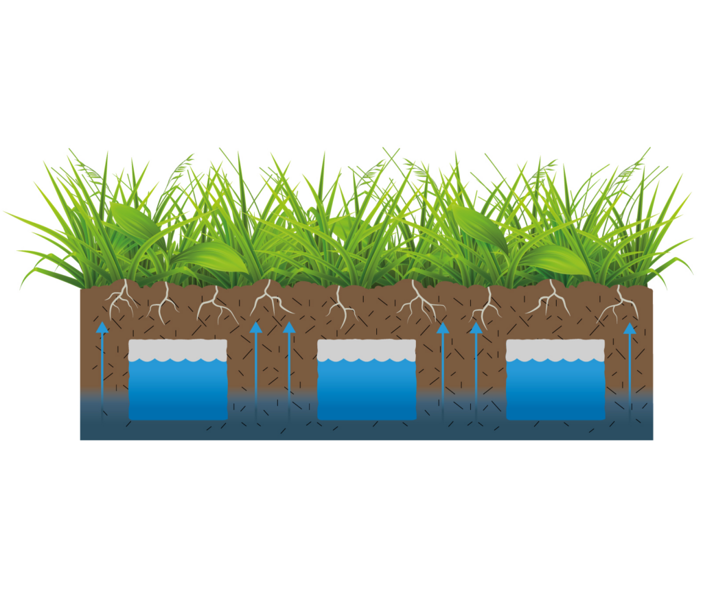 muodostaa maanalaisen vesivaraston, joka vapauttaa veden suoraan juuristoon.