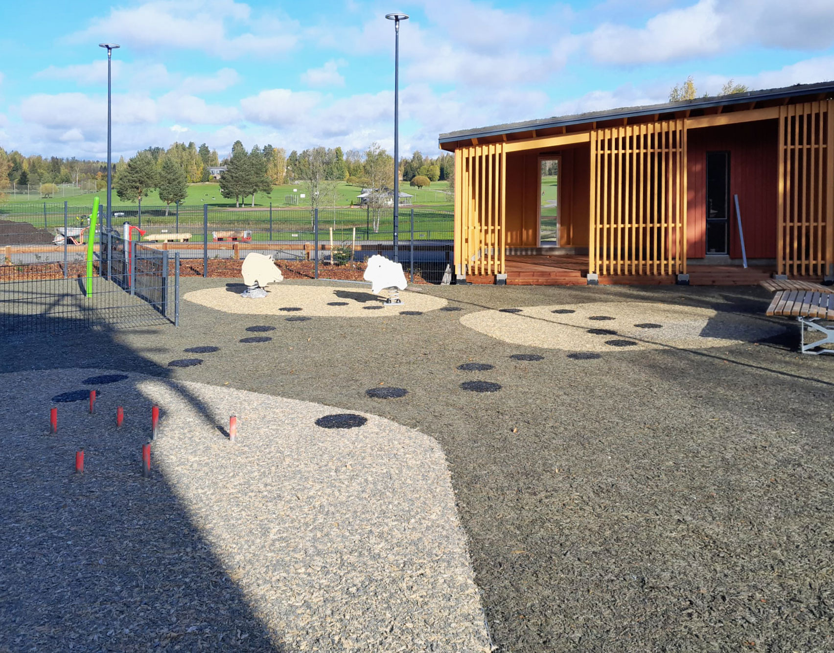 Markkinoiden ainoa kierrätysmateriaalista valmistettu kustannustehokas turva-alusta ja eroosiopinnoite. Turvallinen ja saumaton kumipinnoite. Kumirouhe on kierrätystuote ja värjätty 100% maaväreillä.