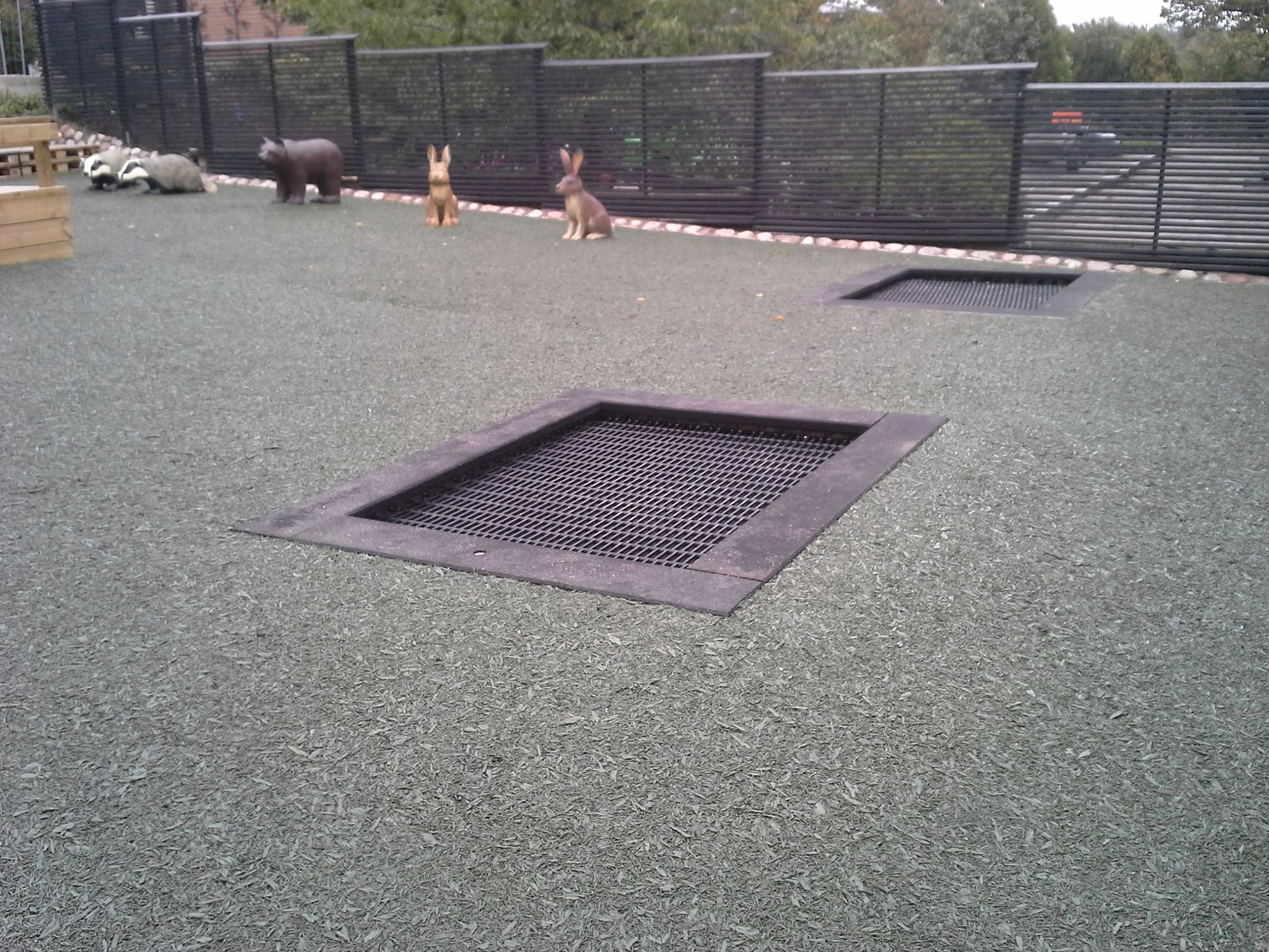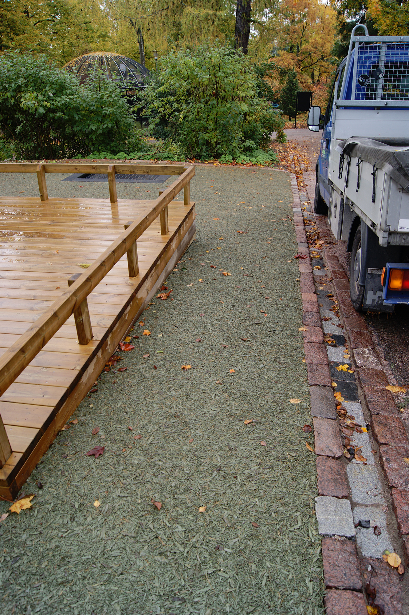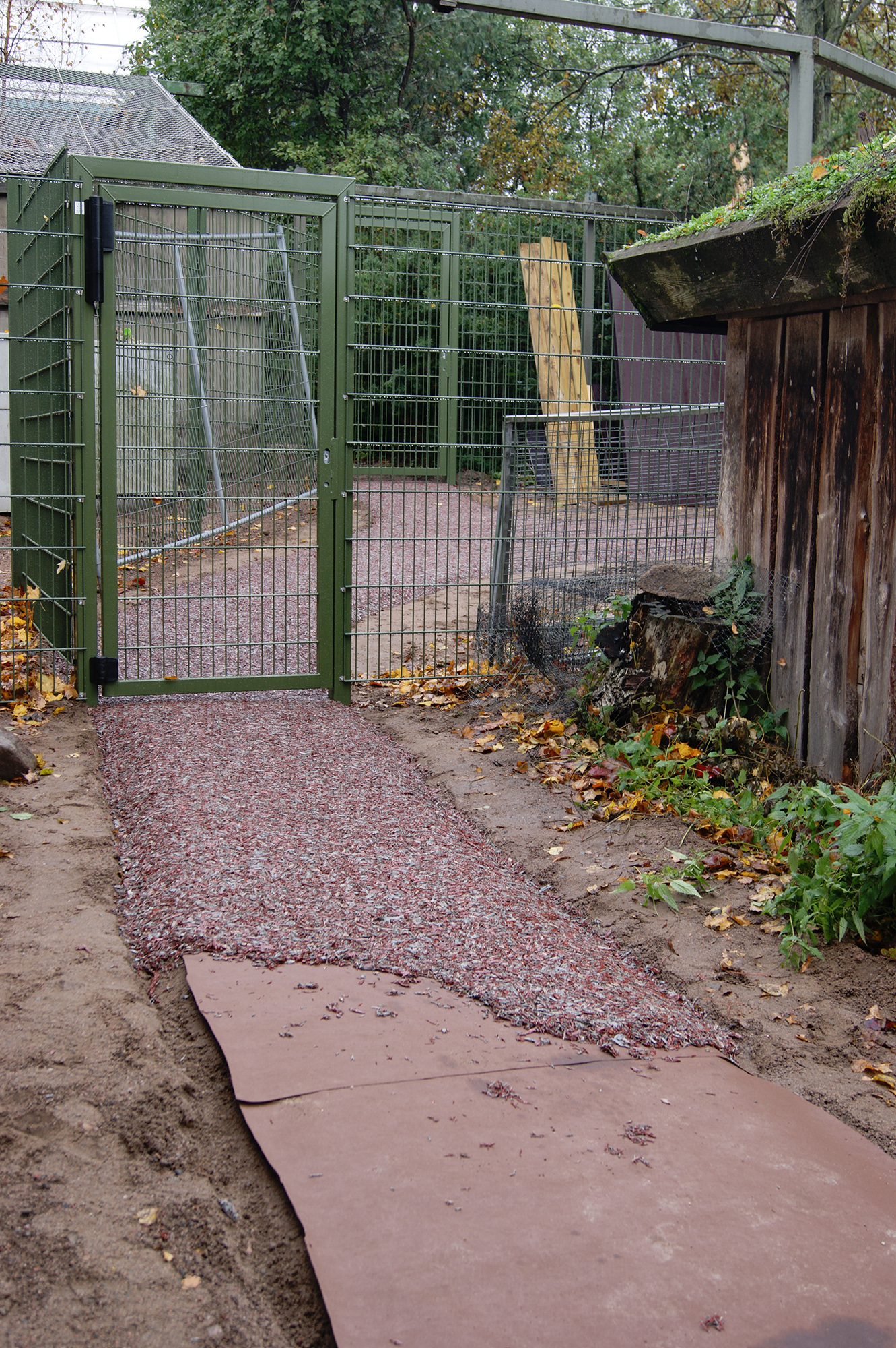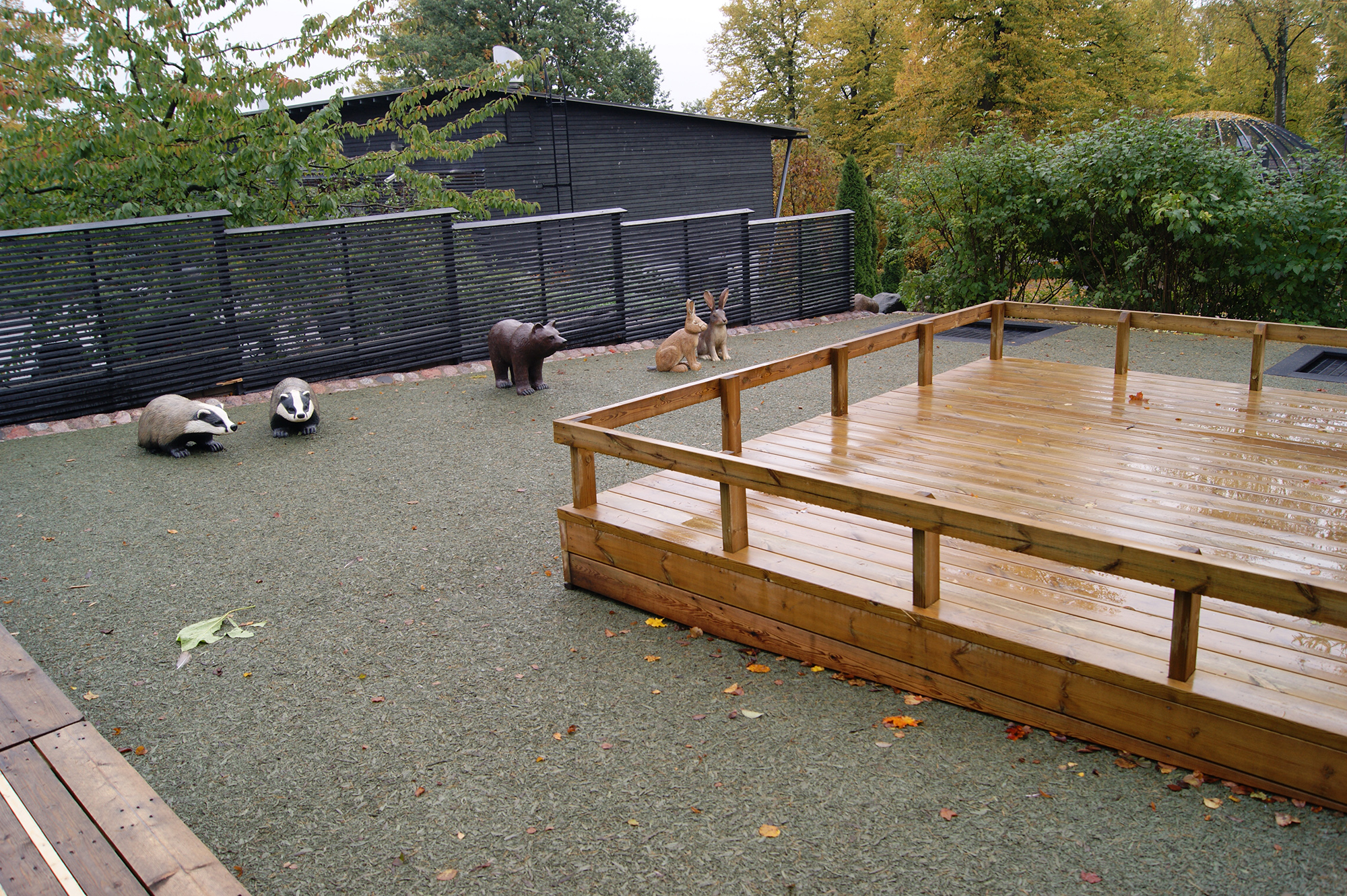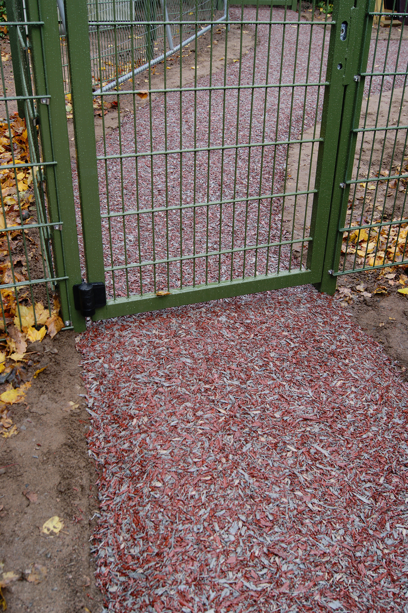 EcoSurface turva-alustaa valettu 40 mm maantasotrampoliinin viereen ja 30 mm eläintarhojen sisälle huoltokäytäviksi.