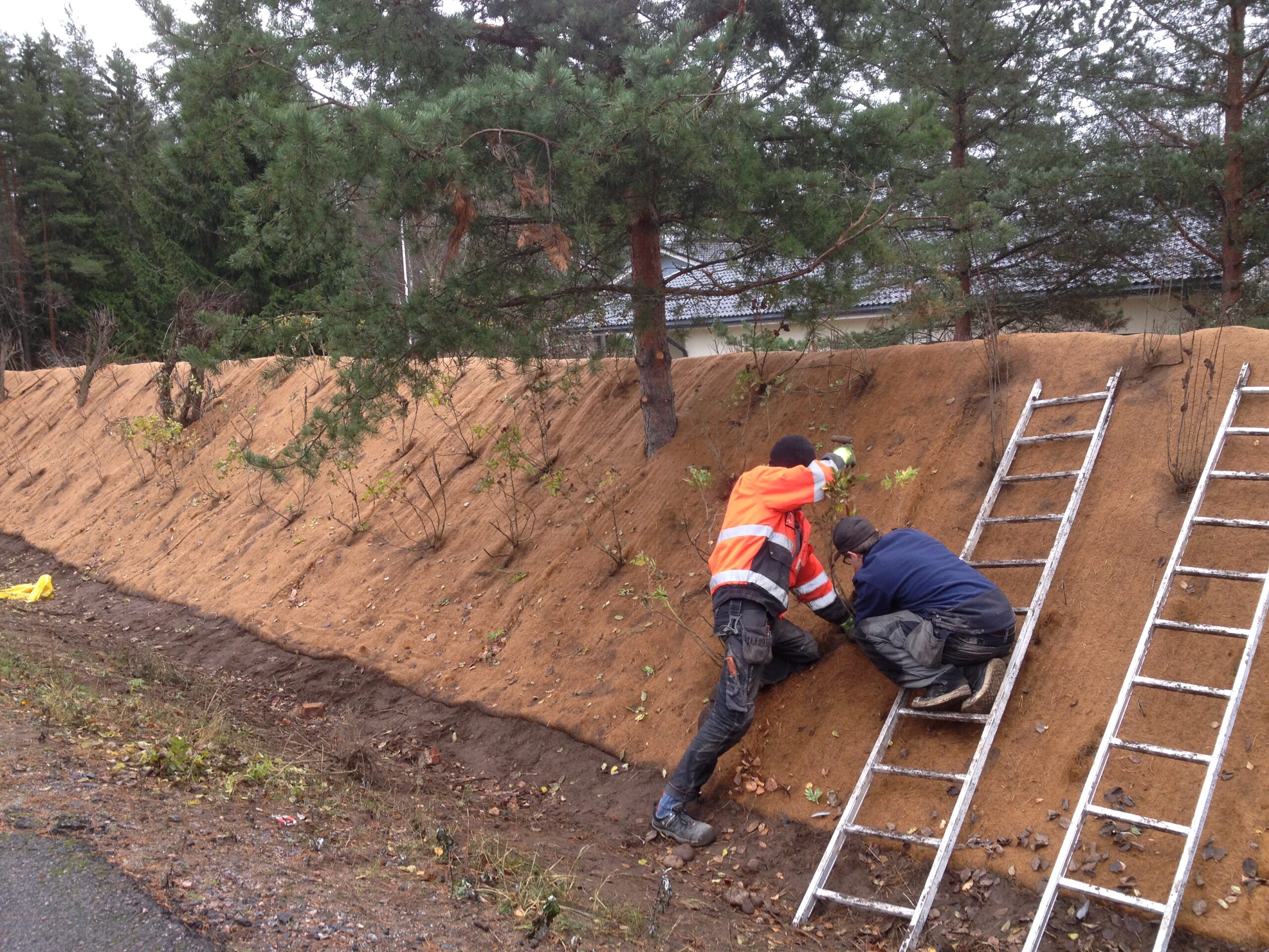 Uusien pensasistutusalueiden pintaeroosion hallinta ja kasvun edistäminen Greenfix 9 pensaseroosiomatolla.