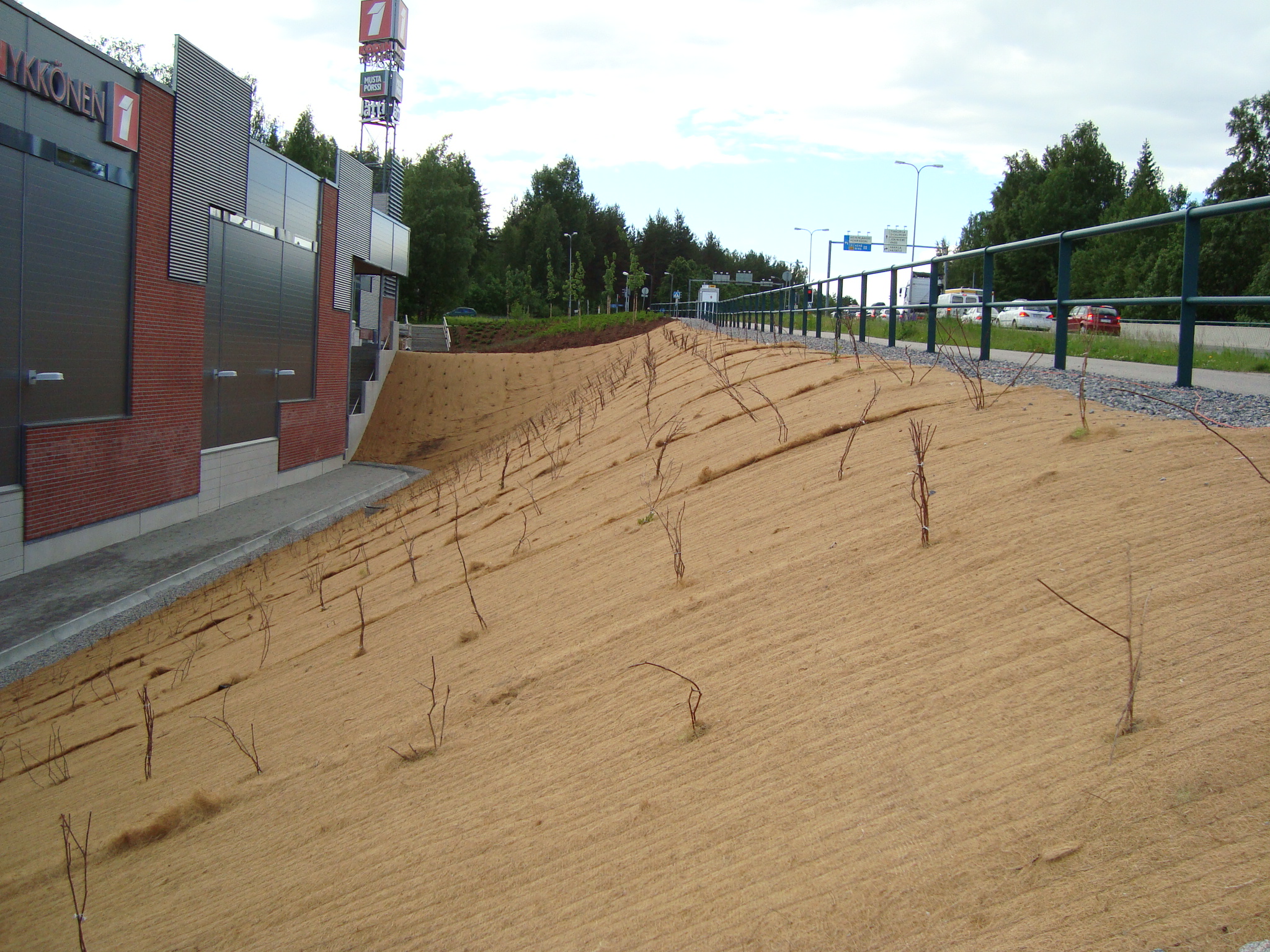Luiska-alueiden suojaus Greenfix 9 pensaseroosiomatolla. Pensaseroosiomatto on asennettu Soilweb luiskakennoston päälle suojaamaan rinnettä pintaeroosiolta ja optimoimaan pensaiden kasvua. Luiskakennosto asennettu pensaseroosiomaton alle tieliittymästä johtuvan vedentulon/maasortuman vuoksi.