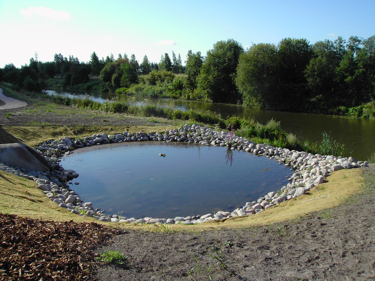 Hulevesiviivätysaltaita, vedet johdetaan Vantaan jokeen.