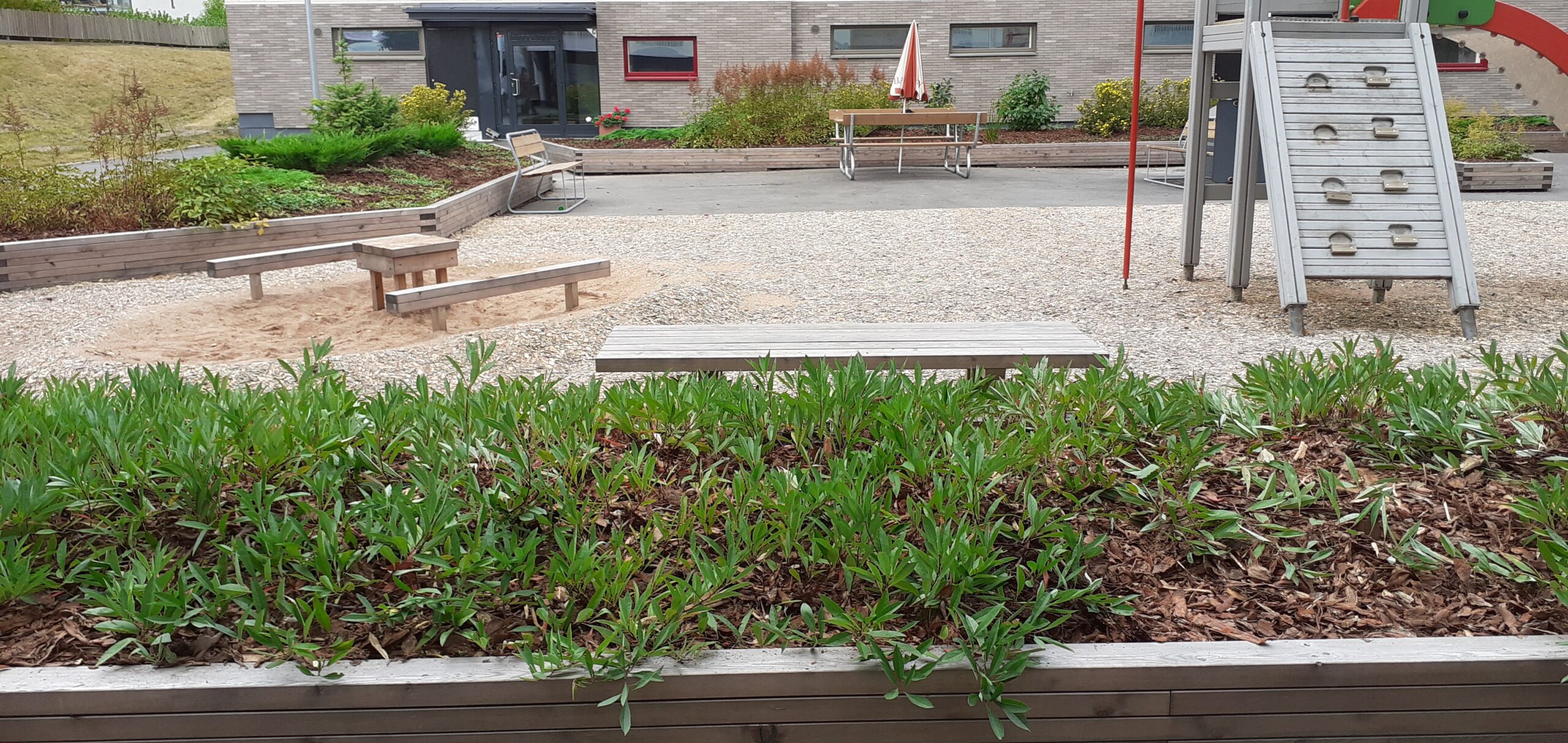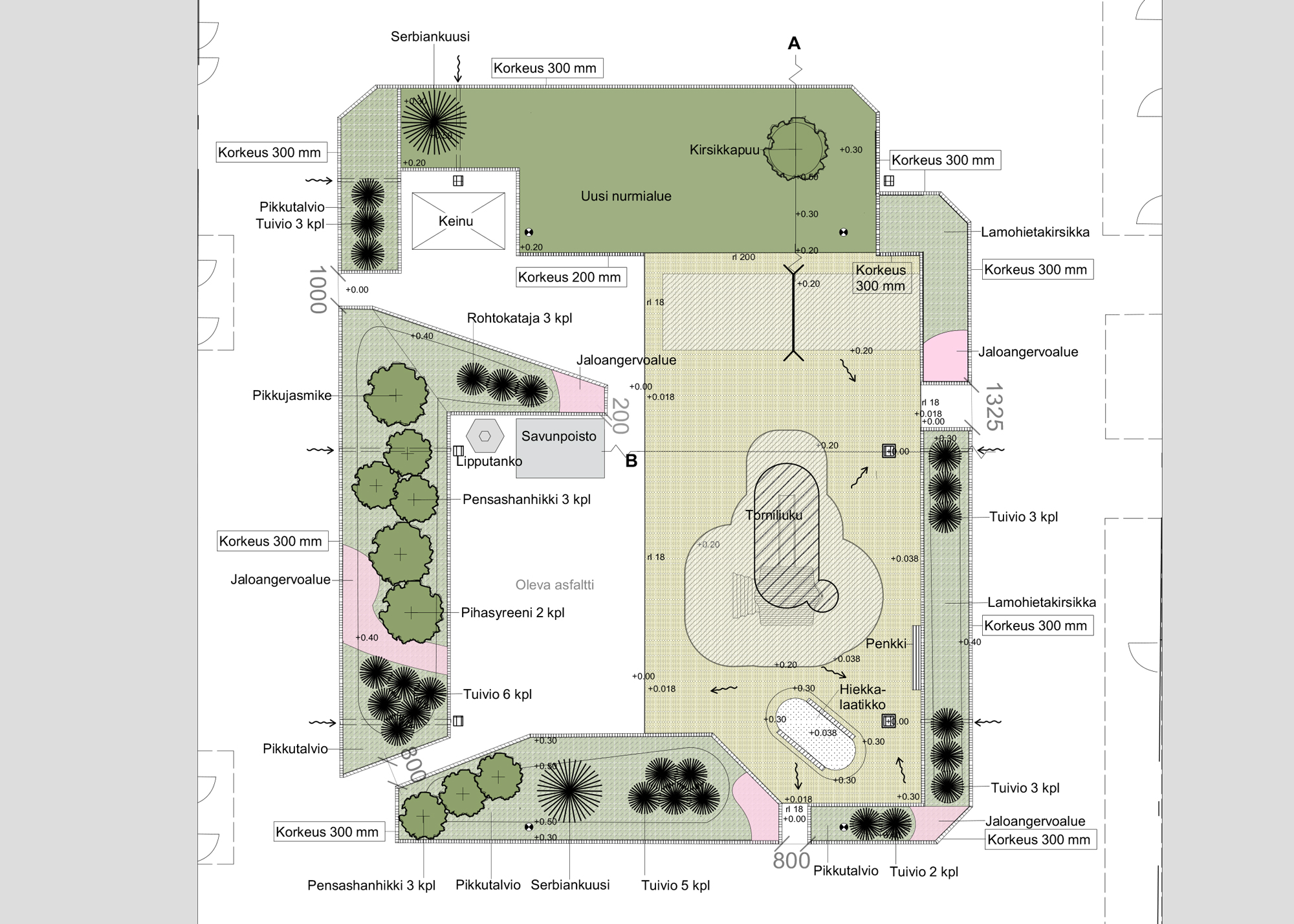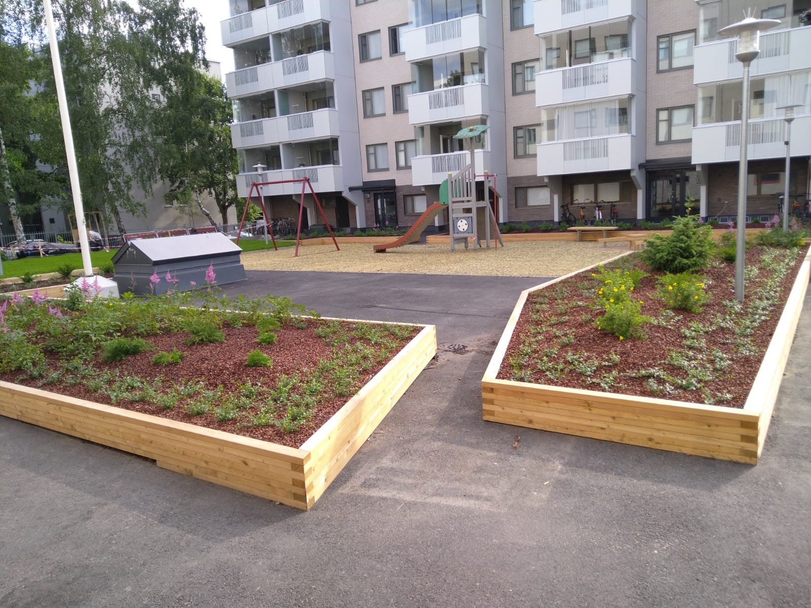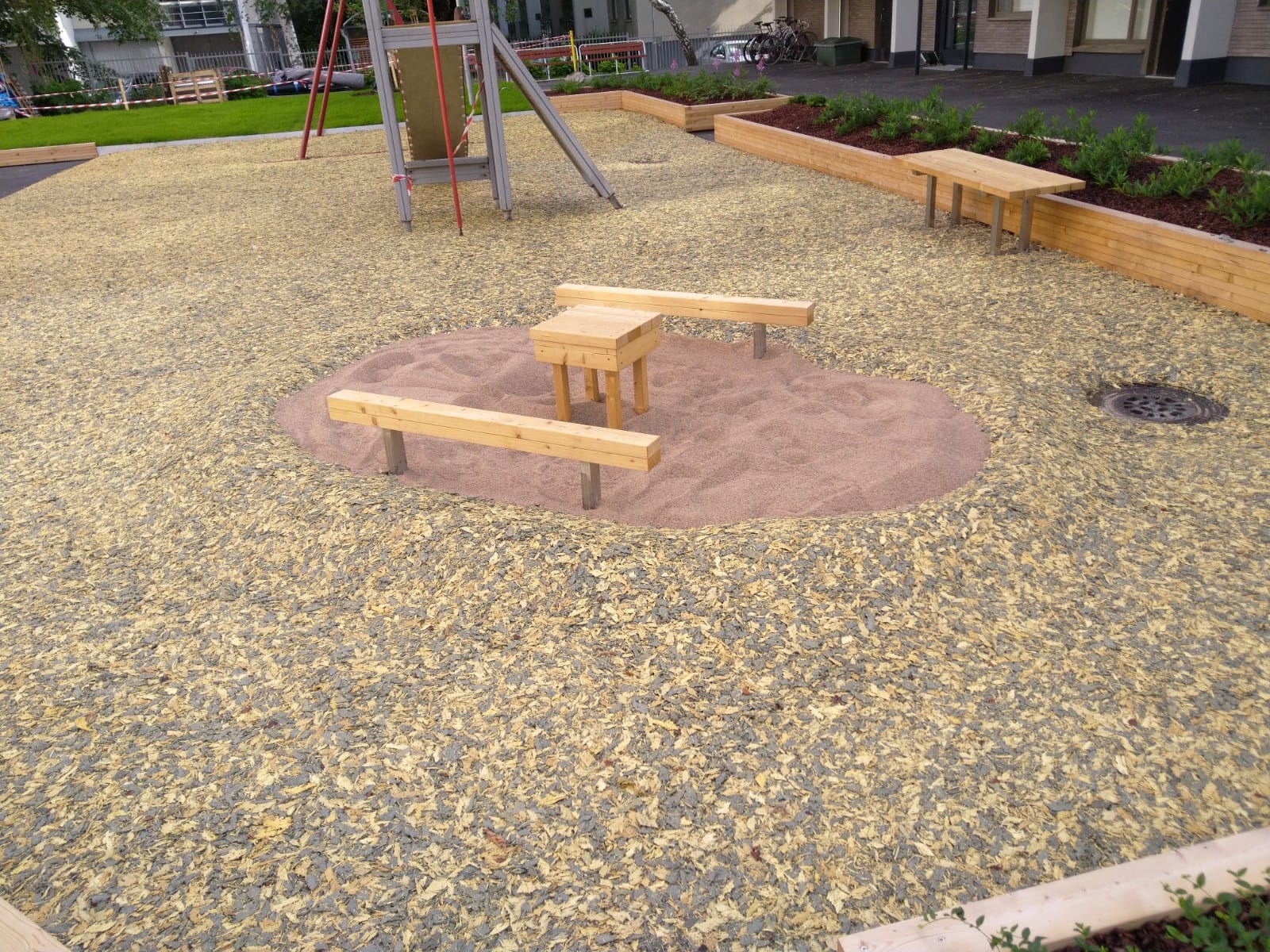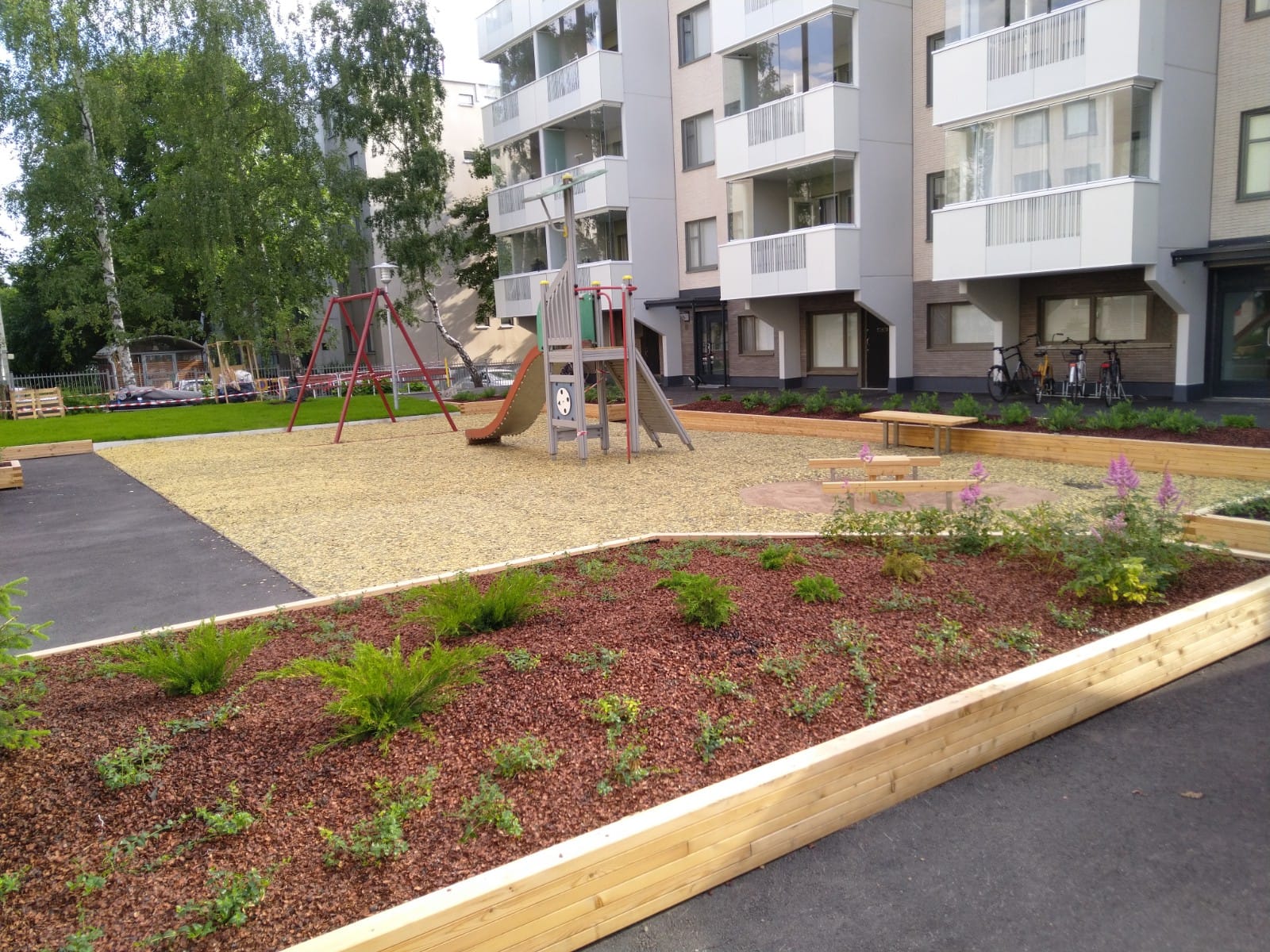 Pihaan on asennettu Ecosurface turva-alustaa, väri Supamulch, sekä istutusalueille kaakaohaketta.