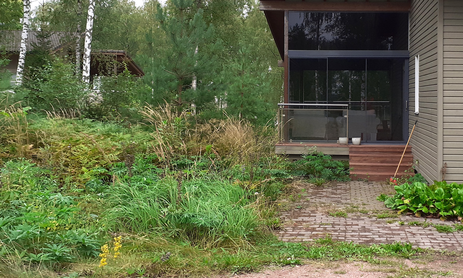 Suunnitelman lähtökohtana oli luoda näkösuojaa ja vaihtaa kulkuväylien yhteydessä olevaa kasvillisuutta. Toteutuksen yhteydessä torjuttiin vieraslaji lupiinia, jota kasvoi laajalti tontilla. Uusi kasvillisuus koostui lehtipensaista, havupuista ja perennoista. Perennoista osa oli luonnonvaraisia ja lähtökohtana käytettiin dynaamisen istutuksen ideaa. Suunnitelmaan kuuluivat myös valaistus, pintamateriaalit sekä terassi. Katteena on käytetty kaakaokuorikatetta.