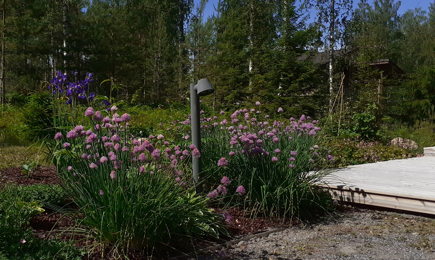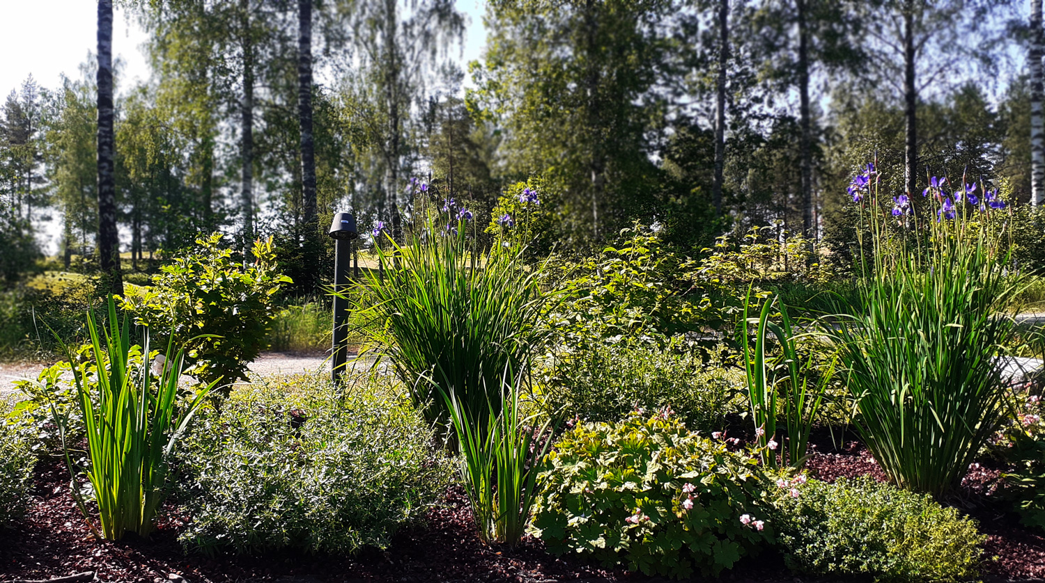 Suunnitelman lähtökohtana oli luoda näkösuojaa ja vaihtaa kulkuväylien yhteydessä olevaa kasvillisuutta. Toteutuksen yhteydessä torjuttiin vieraslaji lupiinia, jota kasvoi laajalti tontilla. Uusi kasvillisuus koostui lehtipensaista, havupuista ja perennoista. Perennoista osa oli luonnonvaraisia ja lähtökohtana käytettiin dynaamisen istutuksen ideaa. Suunnitelmaan kuuluivat myös valaistus, pintamateriaalit sekä terassi. Katteena on käytetty kaakaokuorikatetta.