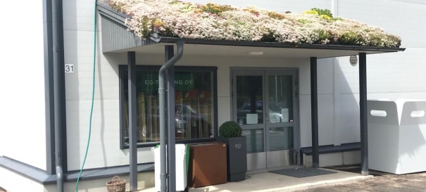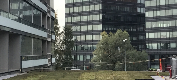 Kohteessa Nordic Green Roof® maksaruohoviherkatto, Diadem kattopuutarhakennot Diadrain 25 sekä Diadem KSE tarkistuslaatikot, istutusaltaissa käytetty Diadem Diadrain 40 kennoja ja Plantex maakatekangasta.