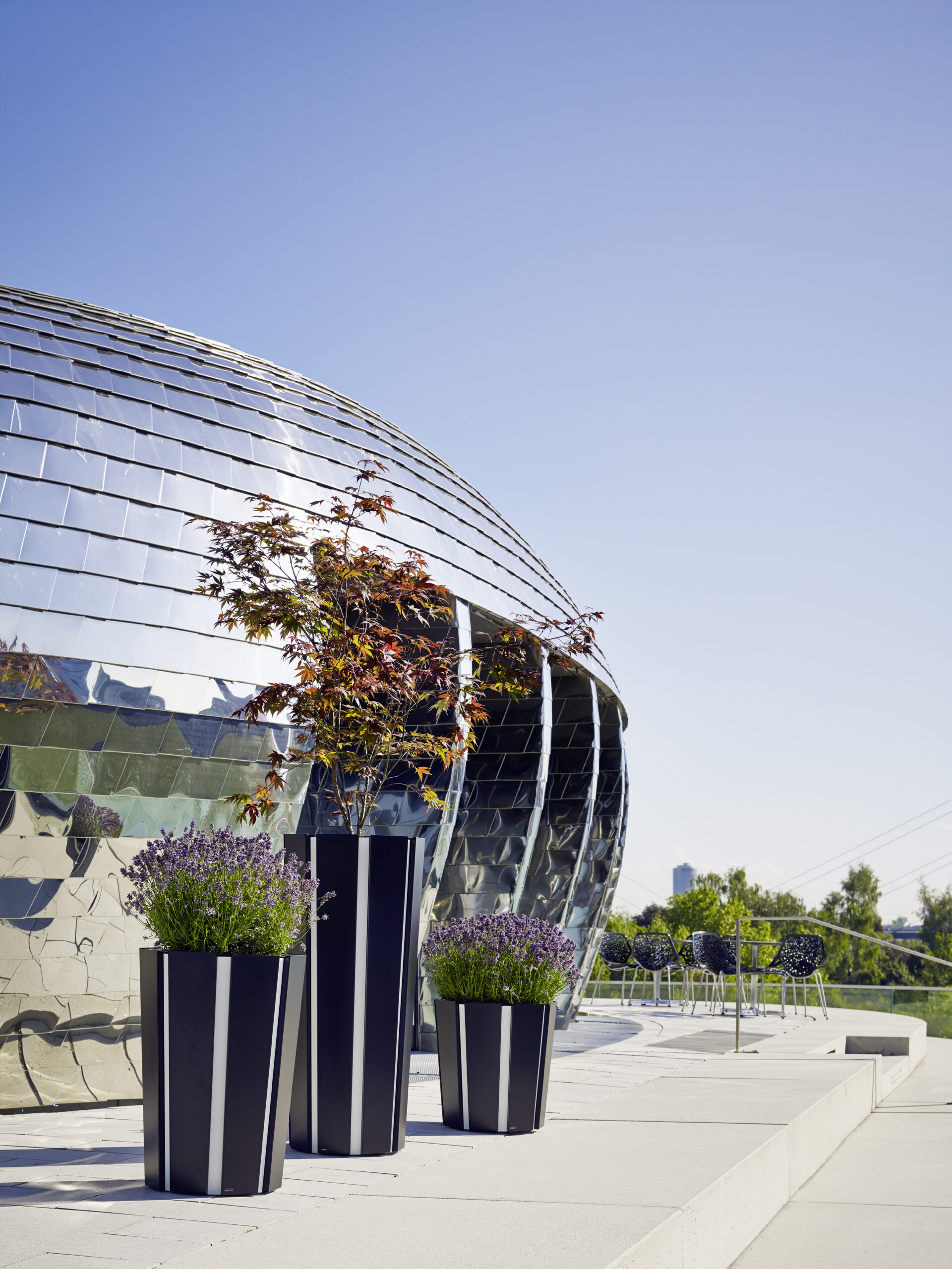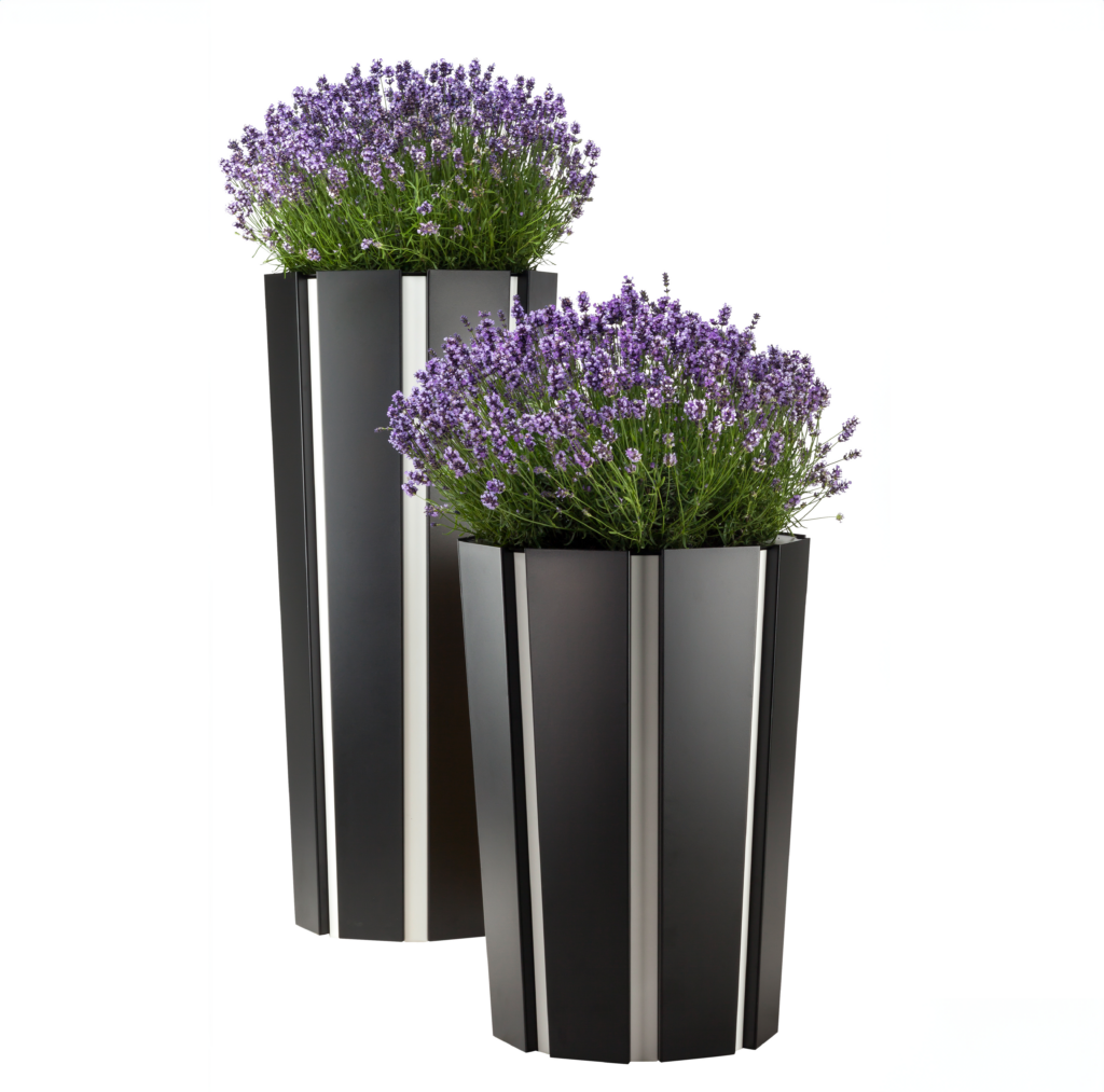 Kolme eri kokoa täydentävät toisiaan saumattomasti. Yksittäinen istutusastia toimii katseenvangitsijana sellaisenaan, ja ryhmiteltynä ne luovat vaikuttavan kokonaisuuden rehevän kasvillisuuden kanssa.