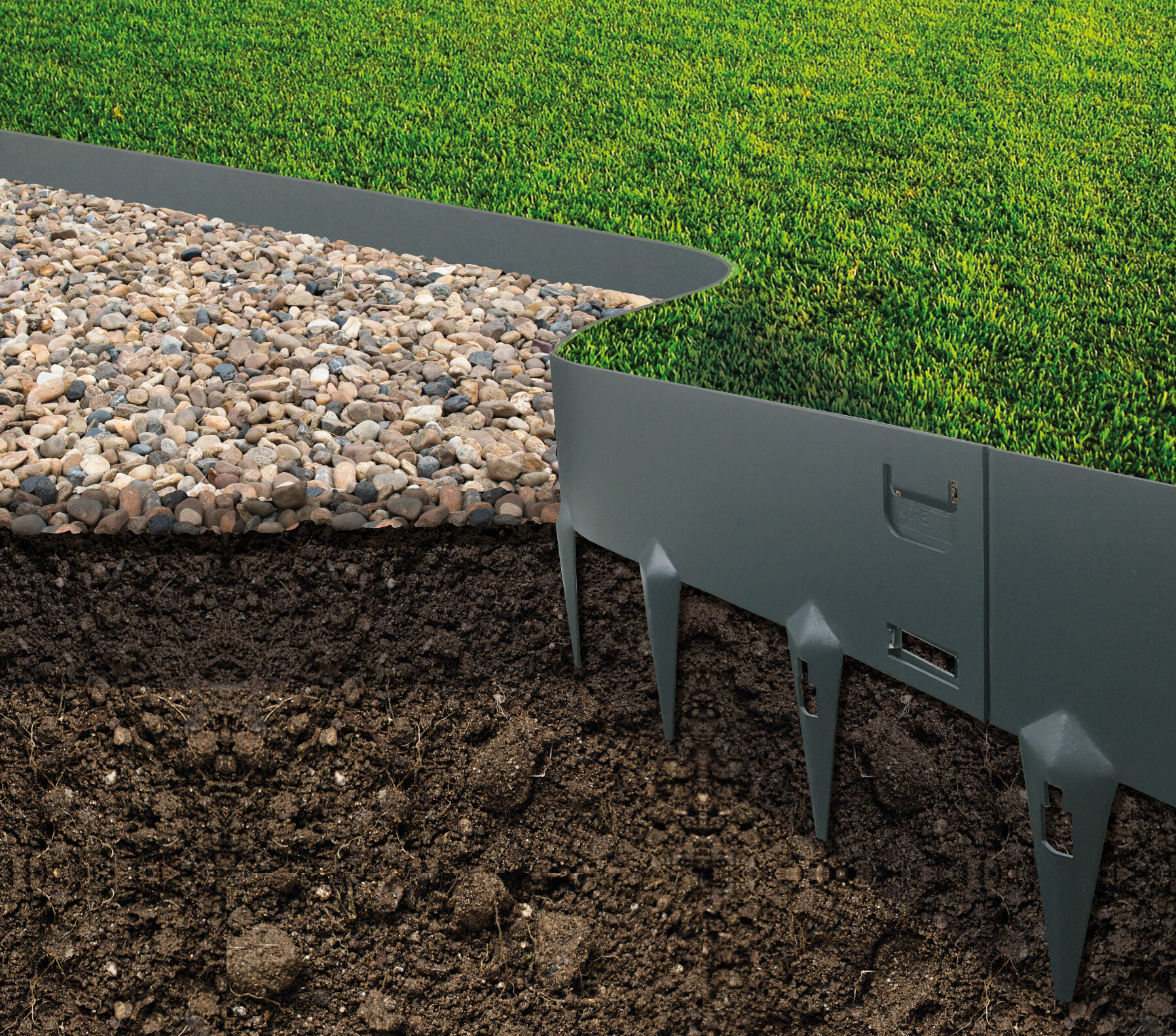- 100 mm Selkeämpi ja näkyvämpi rajaus, joka luo vahvan ja viimeistellyn ilmeen. Sopii esimerkiksi nurmikon ja sorapinnan erottamiseen.