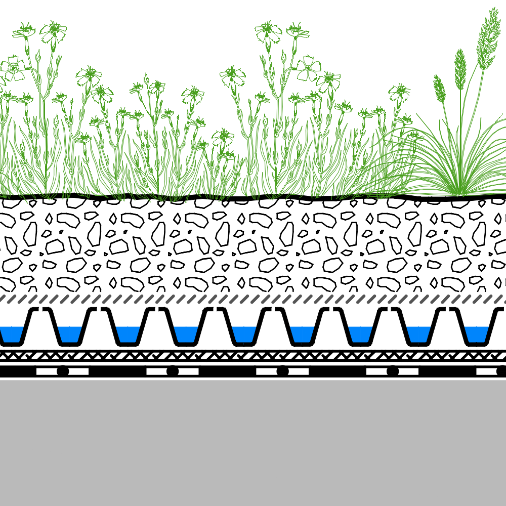 Floradrain® FD 25-E on sopiva salaojitus ja vettäpidättävä elementti tälle järjestelmälle. Sillä on tarvittava puristuslujuus, matala profiilikorkeus, se on kevyt ja se kestää kävelyä. Sopivat kasvivalinnat yhdessä